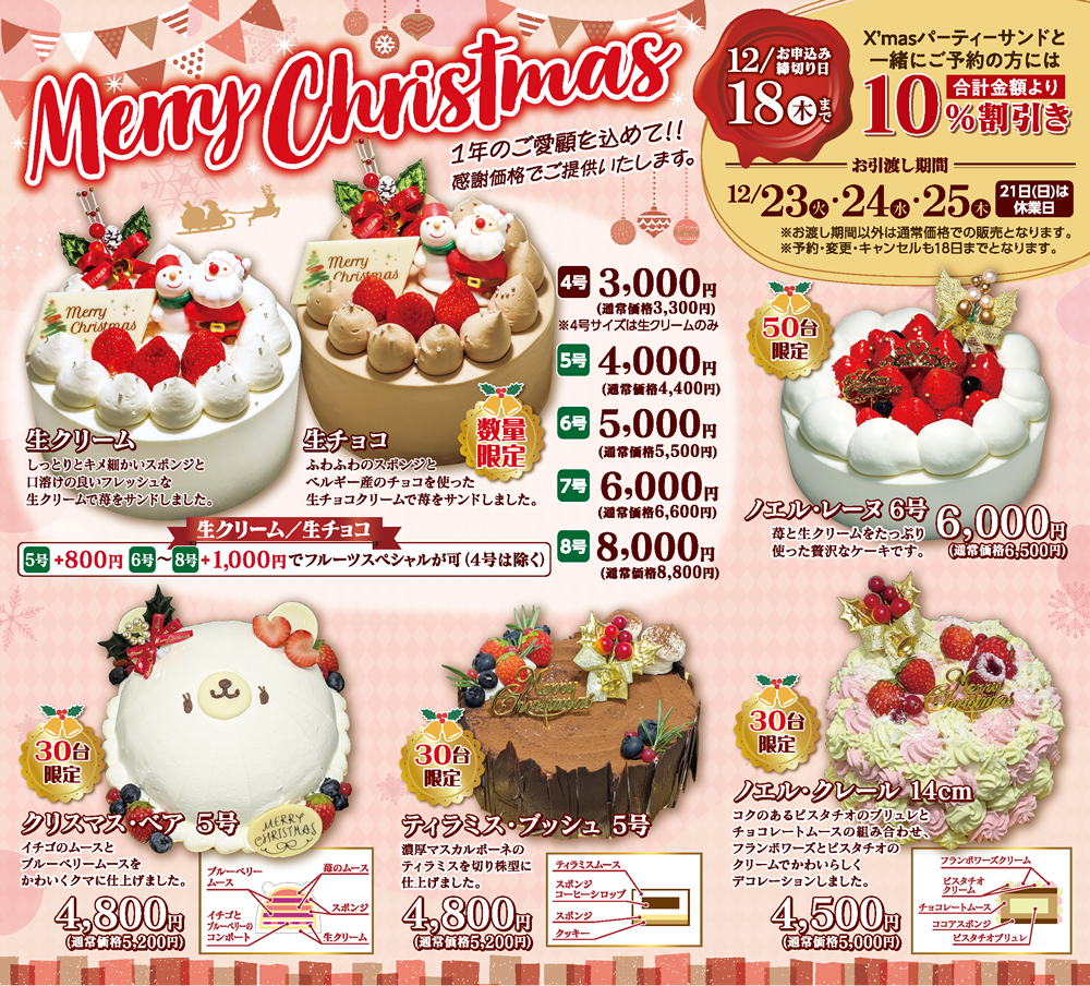 ご予約商品の内容変更(商品・お渡し日)・キャンセルにつきまして は、12月18(木)19時まで。 ★XmasケーキのチラシPDFはこちらから(PDF:5.57MB)